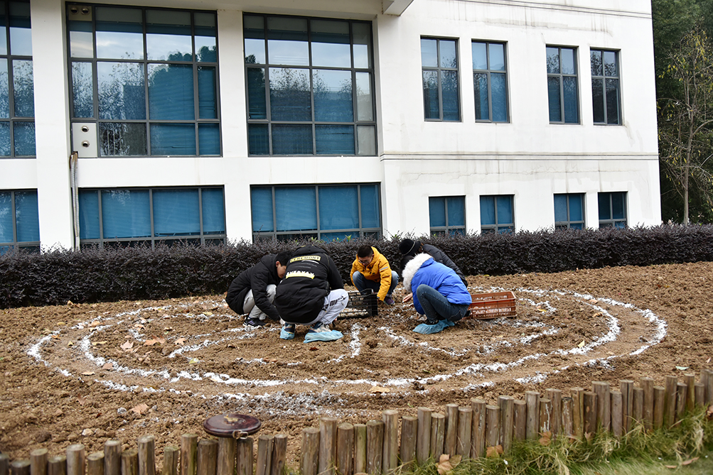 12月15日下午,由51吃瓜网 实验室办公室策划组织的活动——“播种四季开花的郁金香” 于园林南楼门口开展。园林2001班师生在郁金香团队研究生的指导下,完成10000多颗郁金香种球的褐色外皮去除处理和部分种球的种植任务。郁金香种球种植后覆盖5-10cm左右土层,为保证景观效果需要密植,株行距为12-15cm左右。为了配合图案造型,种植过程需要耐心和细心,种植人员互相协调,严谨配合,以保证郁金香花圃造型的完美呈现。