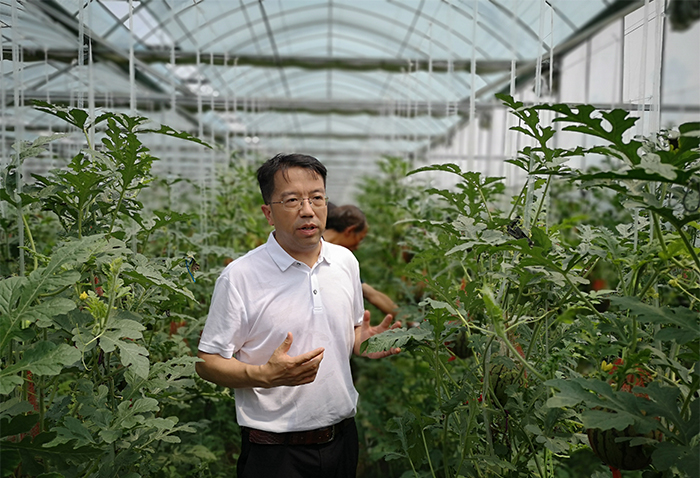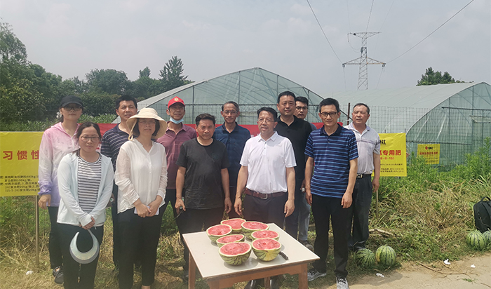 1日上午,与会代表首先观摩了西甜瓜专用肥的效果,湖北省园艺学会西甜瓜专委会组织专家对别之龙教授和湖北宜施壮农业科技有限公司联合研发的西甜瓜专用肥进行西瓜田间测产和品质测定,从对照和示范大棚各随机采收12个西瓜,现场测定单果重和果实中心糖、边糖含量,发现西甜瓜专用肥配方比对照增产31.4%,中心糖含量较对照提高9.5%且口感更好,表明示范的西甜瓜专用肥具有显著增产提质效果,为大规模应用示范奠定了基础。与会代表还现场观摩了西甜瓜设施栽培新品种和新模式,别之龙教授现场讲解了多年来在该基地进行新品种、新技术和新模式的示范应用效果,介绍了“大棚西瓜-绿色水稻-高油酸油菜苔”一年三茬的高效绿色生产模式,并接受了荆门电视台记者现场采访。在观摩研讨会上,荆门市农业农村局蔺江霞副局长、付祖科调研员和与会代表对别之龙教授研发的设施西瓜栽培新技术成果应用予以高度肯定,今后将在荆门市和湖北省其他西甜瓜主产区进一步示范推广。