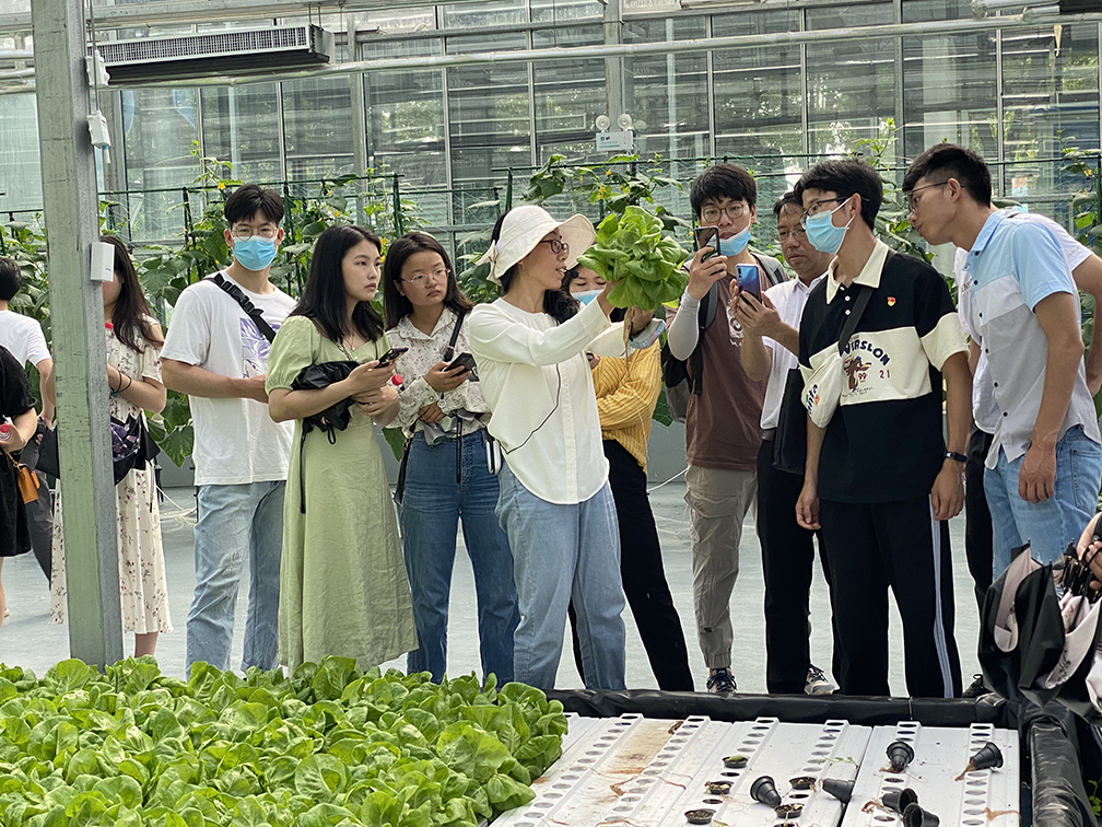 随后,师生共同前往农业科技展示馆,在这里,武汉市农科院蔬菜研究所的张润花博士、王芸博士向同学们介绍了LED流利式货架动态栽培模式、DFT床式栽培模式等农业技术。在LED人工光植物工厂,张润花博士向师生介绍道:“这一块属于无土的阳台经济,是纯水培的,上面放的是陶粒,植物自己就会在这里面扎根,下面放的是营养液,无需人工监护,整个过程没有农药。事实上,疫情之后,无土栽培技术备受关注,同学们可以在日后多了解这方面的培育技术。”2020级研究生党员刘旭阳参观完以后感慨颇多,她说:“馆里的水培技术和一体化管理技术先进一流,在近乎全机械化的操作下,所有的作物都长得整整齐齐, ‘统一、规范、标准化’是给我的第一印象,本次党日活动让我感受到了种业科技的力量,体会到了农业智能化水平的进步,未来的农业产业必将大有可观!”
