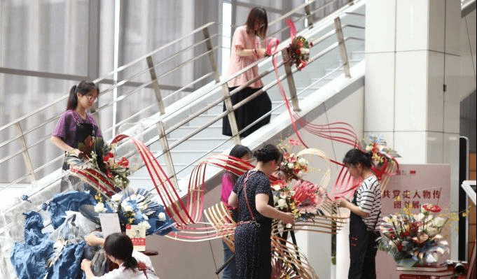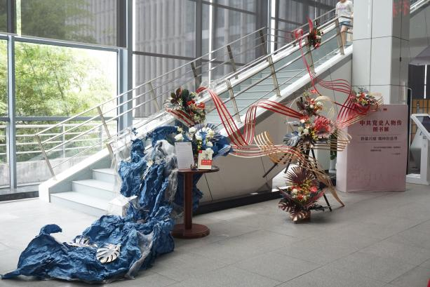 最终呈现的花艺作品“印象·红与蓝的交响曲”聚焦“斗争”主题,整个作品从左至右斜倚图书馆阶梯一侧,以曲折蜿蜒、昂扬向上的大型架构表现人类顽强奋斗的历程。颜色主要为红蓝两色,与一般室内花艺装饰不同,本次花艺创作借鉴“印象派”,在自然光照下进行插花,追求光线和色彩的变化,专注表现书中红与蓝的色彩印象。左下方以蓝色非植物性材料表现大海的汹涌澎湃,玫瑰、跳舞兰等花材随着浪潮奔涌向前,象征着如圣地亚哥一般顽强勇敢的人们;色彩逐渐过度到红色,右侧从下至上,婉转昂扬的是并排绑扎的红色、原木色竹篾,象征着共产党人“筚路蓝缕、以启山林”的奋斗历程,以红掌、红色康乃馨庆贺中国共产党百年诞辰,点缀其间的跳舞兰象征科学社会主义火种在华夏大地燃起熊熊希望之火,震烁寰宇,昭示未来!