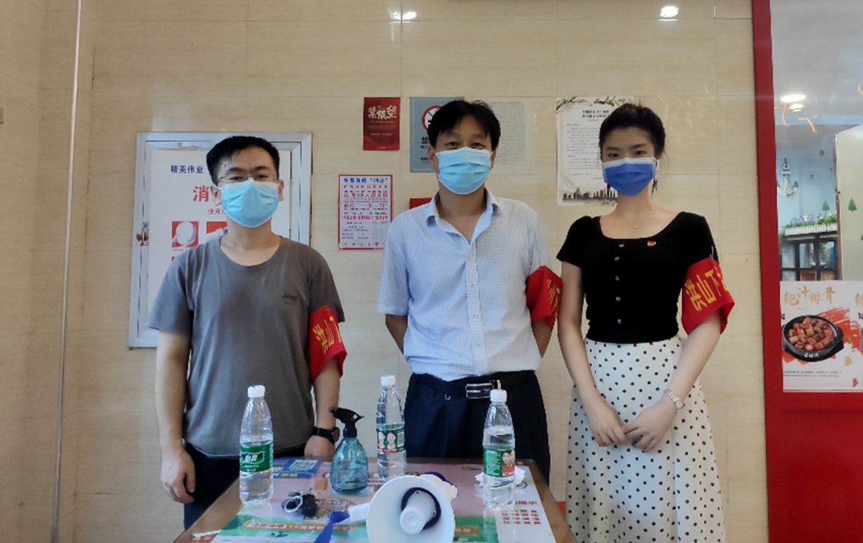 伴随着淅淅沥沥的小雨,教师党员腾明君、学生党员李楚婷和学生党员韩福踏上了前往步行街的路。由于天气原因,美食城来往的客人不是很多,进出次数最多的是外卖小哥,尽管全身湿透,外卖小哥仍然一次次重复测着体温。滕明君老师从到达岗位之后就再也没有停下,交接、指挥、测量体温,汗水浸湿了他的上衣,他只是笑了笑,表示没有问题。