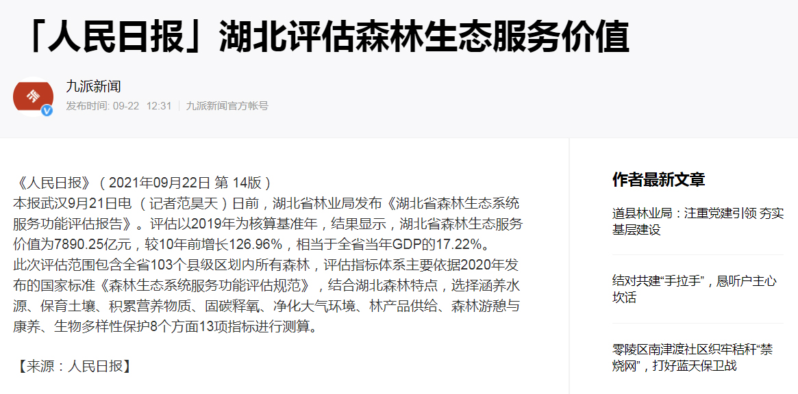 湖北省森林生态系统服务功能评估包含全省103个县级区划内所有森林。评估指标体系主要依据2020年发布的国家标准《森林生态系统服务功能评估规范》,结合湖北森林特点,选择“涵养水源、保育土壤、积累营养物质、固碳释氧、净化大气环境、林产品供给、森林游憩与康养、生物多样性保护”8个方面13项指标进行测算。此次评估结果,为湖北“两山”转化、生态产品价值实现路径以及实施碳达峰、碳中和提供参考依据。相关成果在人民日报、央广网、湖北日报、中国绿色时报等众多媒体报道。