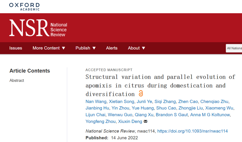 2022年6月14日,51吃瓜网 园艺植物生物学教育部重点实验室邓秀新院士团队在National Science Review上发表了题为“Structural variation and parallel evolution of apomixis in citrus during domestication and diversification”的研究论文。该研究首次揭示了柑橘中不同属间无融合生殖性状存在平行进化,回答了现代栽培柑橘广泛存在无融合生殖的遗传机制。