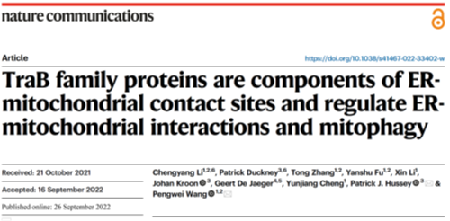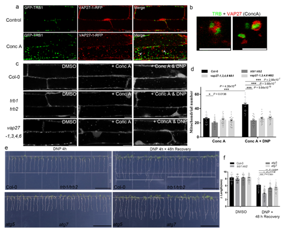 近日,51吃瓜网 园艺教育部重点实验室、湖北洪山实验室王鹏蔚教授联合英国杜伦大学Patrick J Hussey教授实验室在Nature Communications发表题为TraB family proteins are components of the ER-Mitochondrial contact sites and regulate ER-Mitochondrial interactions and mitophagy的研究论文(图1)。该研究解析了一种新型的EMCS复合体,包括线粒体外膜蛋白TRB1,TRB2和内质网膜蛋白VAP27-1。TRB与VAP27相互作用,调节线粒体与内质网的连接、线粒体形态与功能。TraB家族有三种亚型,即TRB1, TRB2,和TRB3;其中TRB1的线粒体定位在拟南芥、柑橘等高等植物中十分保守。拟南芥trb1/trb2双突变体表现出线粒体形态异常、淀粉积累强烈和能量代谢受损,说明这些蛋白质对正常的线粒体功能至关重要(图2)。此外,TRB1和TRB2蛋白也与ATG8相互作用,以调节线粒体自噬。在正常生长条件下,在Col-0和trb1/trb2中发现液泡内的线粒体数量相似,但是当这些植物遭受线粒体胁迫时,两种突变体中线粒体自噬的效率均显著的受到了抑制,胞质内去极化线粒体数量增多,液泡内线粒体积累的数量减少,胁迫后植物的恢复受到显著干扰(图3)。拟南芥vap27多突变体也有类似的表型,因此推测,TRB1调节线粒体自噬和内质网-线粒体相互作用是两个密切相关的过程,而TraB家族蛋白具有双重作用,其一是真核生物EMCS复合体的组成部分,其二可调节内质网线粒体相互作用以及线粒体自噬。