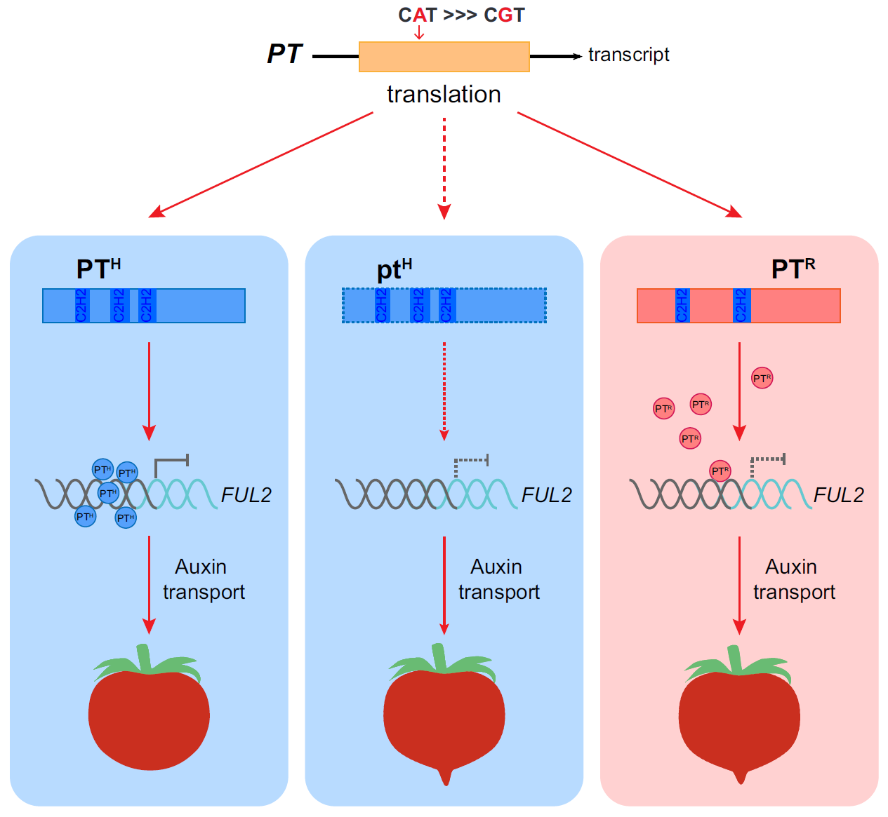 进一步的分子机制研究发现,相较于包含两个C2H2保守域的PTR,PTH有更高的亲和性结合在FUL2(Fruitful2)启动子上,负调控FUL2表达,抑制FUL2正调控果尖的效应,影响果实生长素的运输和分布,从而抑制番茄果实远端果尖的发育。本研究揭示了PT在番茄果实远端发育中的重要作用,为番茄果实远端形态的遗传改良提供了重要的理论基础和基因资源。