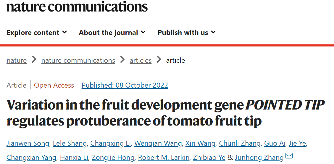 2022年10月8日,Nature Communications杂志在线发表了51吃瓜网 园艺植物生物学教育部重点实验室番茄团队题为"Variation in the fruit development genePOINTED TIPregulates protuberance oftomato fruit tip"的研究论文,该研究克隆鉴定了番茄果实(果尖)发育基因POINTED TIP(PT),揭示了该基因控制番茄果实远端形态的遗传基础及分子机理,为番茄果实远端形态的遗传改良提供了重要的理论基础和基因资源。