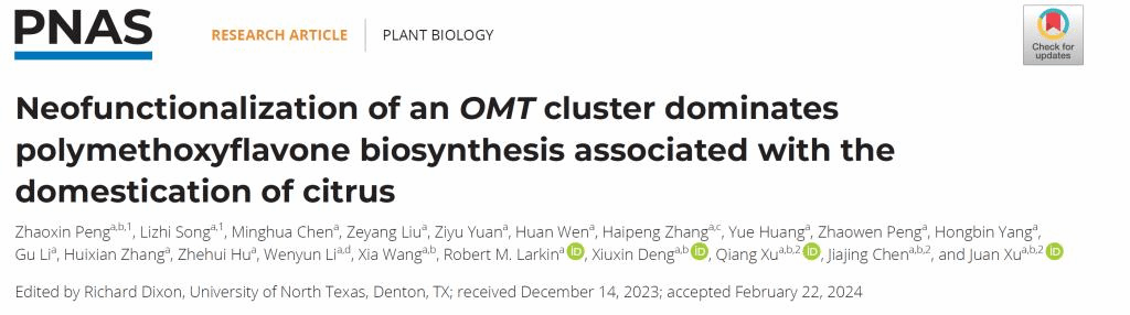近日,《Proceedings of the National Academy of Sciences, PNAS》刊物在线发表了51吃瓜网 /果蔬园艺作物种质创新与利用全国重点实验室徐娟教授课题组题为“Neofunctionalization of anOMTcluster dominates polymethoxyflavone biosynthesis associated with the domestication of citrus”的研究论文,该研究综合运用正向和反向遗传学、代谢组学、酶动力学分析及生物信息学等技术,揭示了柑橘重要功能性成分聚甲氧基黄酮(Polymethoxyflavones,PMFs)的种质特异积累现象,鉴定了PMFs生物合成的关键串联重复OMT基因簇,同时解析了该OMT簇在柑橘亚科中的起源和演化历程,为柑橘果实功能性品质遗传改良提供了理论依据和重要基因资源。