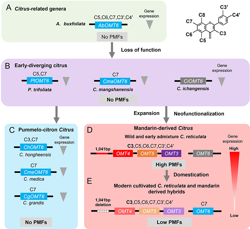 通过比较基因组学和共线性分析,该团队发现该OMT簇源于OMT6基因的扩张,不同类型柑橘中均存在OMT6基因同源基因,仅橘及其后代甜橙中出现OMT簇且积累PMFs(图2)。相较于柑橘近缘种和早期分化柑橘中的OMT6,宽皮柑橘中CreOMT4和CreOMT5多位点的突变促使其获得C3位的O-甲基化修饰功能,揭示了其新功能化的过程,进而在宽皮橘起源的类群中进化出多功能的OMTs,由此在宽皮橘中进化出PMFs代谢通路。此外,相较于野生橘和早期混杂橘,现代栽培橘中CreOMT4启动子上的一段1041bp的片段缺失已证实是导致PMFs总含量显著降低的直接原因(图3)。基于本研究构建了柑橘类黄酮中PMFs支路的代谢通路骨架(图4),后续的调控研究已成为该团队现阶段正在开展的重点。本研究为PMFs生物合成途径的从头合成提供重要依据,同时为功能型柑橘育种提供理论基础。