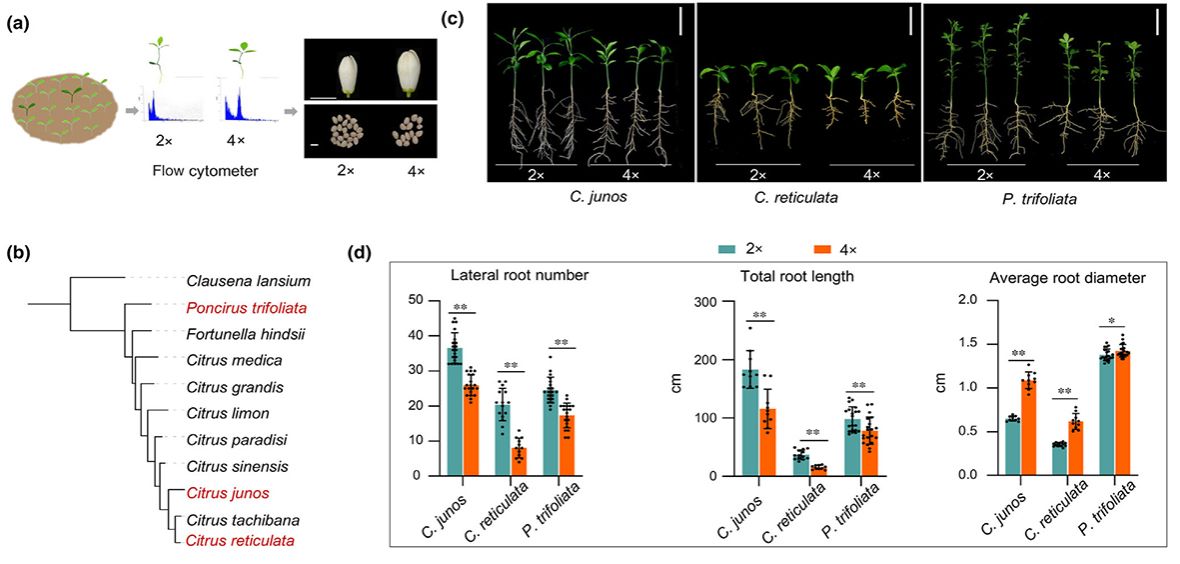 该团队基于自主研发的柑橘珠心胚(孢子体无融合生殖)自然加倍四倍体发掘、单胚性四倍体原位诱导等高效技术,发掘出70余个柑橘不同种类和基因型的四倍体资源,基本涵盖了我国柑橘主要有核品种和砧木类型,为柑橘无核优质广适的三倍体新品种创制、多抗矮化省力的四倍体砧木培育及相关重要性状形成机理研究提供了宝贵的种质材料。在前期大量表型考察与鉴定基础上,初步证明柑橘属和枳属基因组加倍后,表现出较强的盐胁迫耐性。四倍体柑橘砧木在盐胁迫条件下,其根系表现出更强的功能性,包括更低的Na+含量和过氧化氢(H₂O₂)水平,表明其对盐分敏感性较低。尽管多倍体植物具备适应性优势,能应对各种环境压力,但基因组加倍如何通过影响基因表达赋予植物抗逆性,这一机制仍有待深入研究。