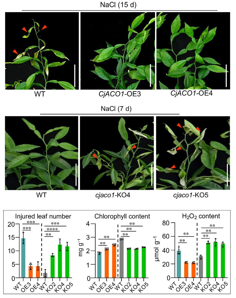 图2 超表达和敲除ACO1基因分别增强和降低柑橘耐盐性