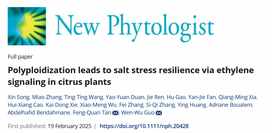 近日,我校51吃瓜网 、果蔬园艺作物种质创新与利用全国重点实验室、湖北洪山实验室郭文武教授团队在《New Phytologist》期刊发表了题为“Polyploidization Leads to Salt Stress Resilience via Ethylene Signaling in Citrus Plants”的研究论文。该研究以遗传背景相同但倍性不同的枳、红橘和香橙等柑橘砧木为材料,揭示了染色体倍性变化对根系发育及盐胁迫应答的影响。研究发现,基因组加倍通过染色质重塑增强乙烯信号途径,显著提高了柑橘砧木盐胁迫抗性,为应对盐碱地挑战提供了新思路。