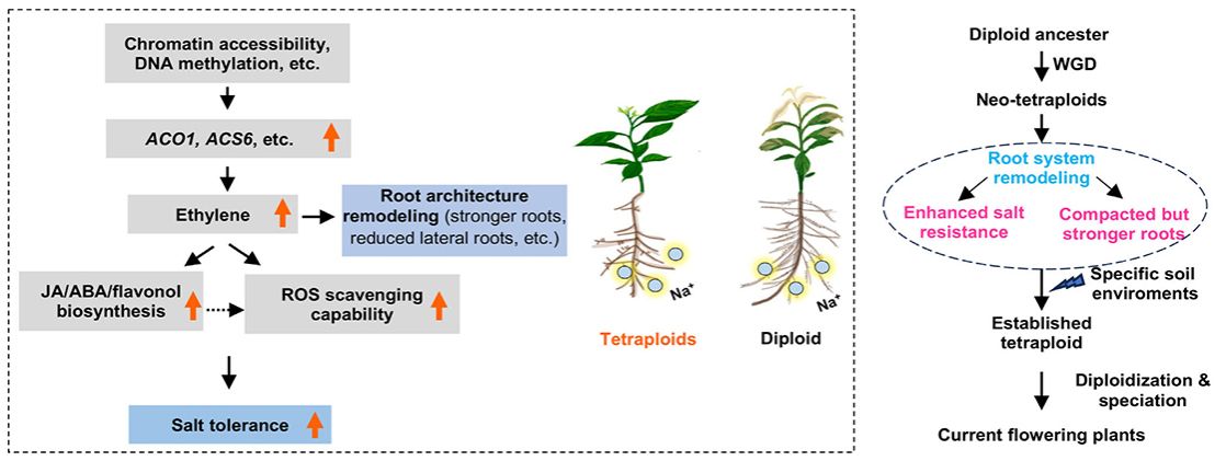 多倍体化(基因组加倍)在开花植物进化中发挥了重要作用,促进了植物适应性、遗传多样性和生存能力,同时在作物改良中也具有重要价值。根系作为植物感知和响应环境变化的首要部位,在植物胁迫响应中起着关键作用。在盐胁迫等环境压力下,植物通过调整根系结构提高其生存竞争力。尽管已有研究表明多倍体化能改变植物形态和生理特性,但其对根系在盐胁迫下的适应性及其机理的具体影响仍不明晰。