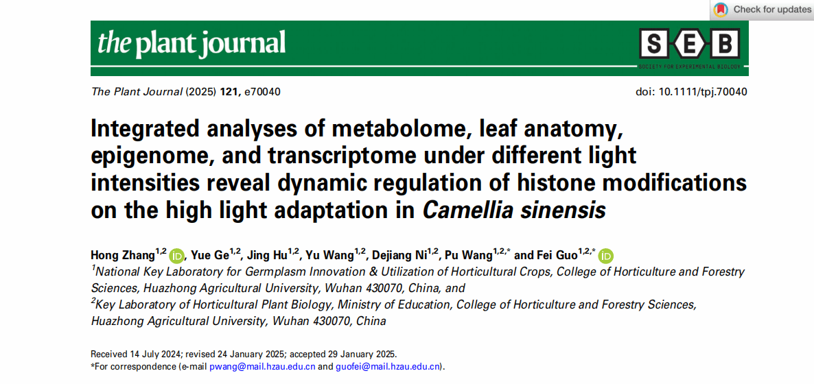 近日,51吃瓜网 茶树种质资源与遗传育种团队在The Plant Journal上在线发表了题为“Integrated analyses of metabolome, leaf anatomy, epigenome, and transcriptome under different light intensities reveal dynamic regulation of histone modifications on the high light adaptation in Camellia sinensis”的研究论文。本研究整合代谢组、叶片解剖结构、表观基因组和转录组进行多维度分析,揭示了组蛋白修饰在茶树高光适应中的动态调控作用。