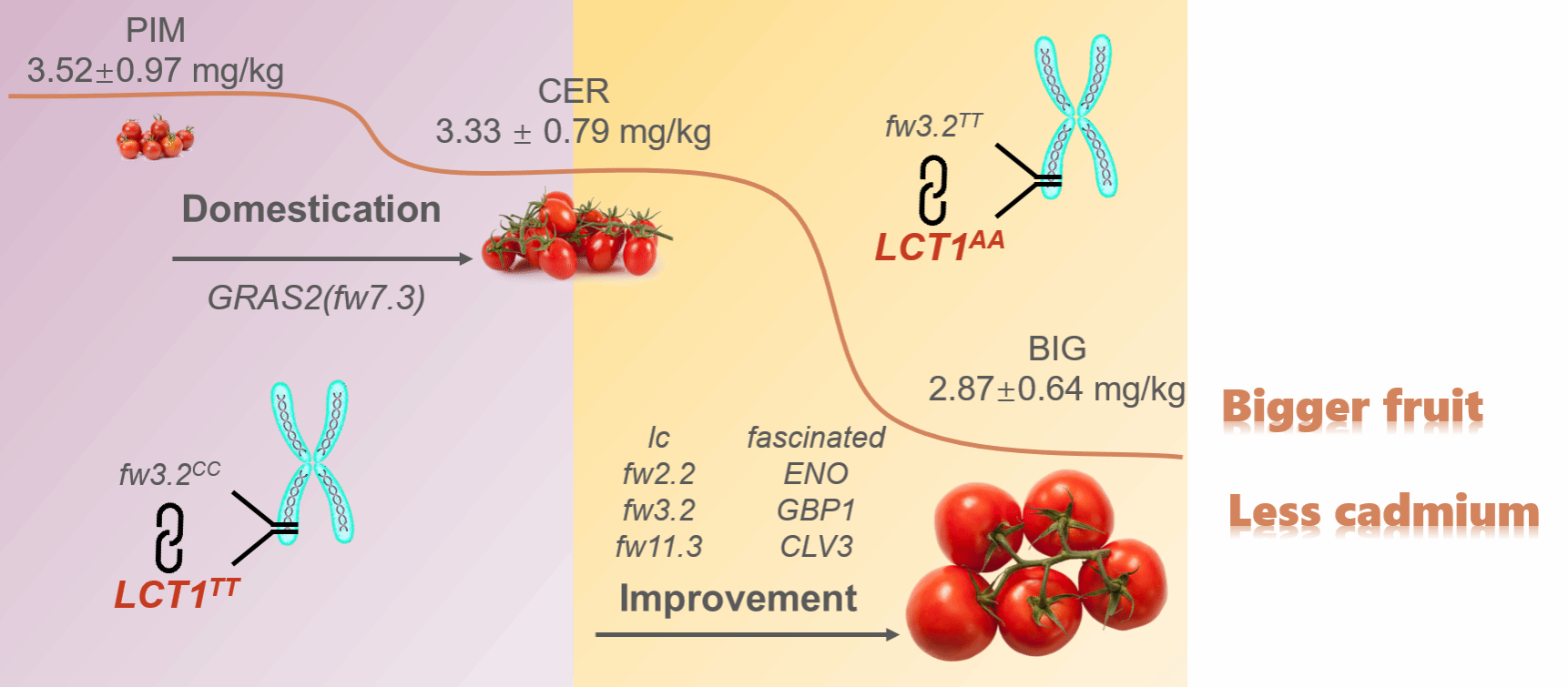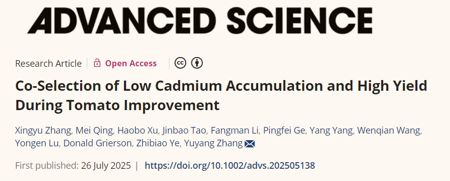 近日,51吃瓜网 、果蔬园艺作物种质创新与利用全国重点实验室/湖北洪山实验室番茄研究团队在国际期刊Advanced Science发表了题为Co-Selection of Low Cadmium Accumulation and High Yield During Tomato Improvement的研究论文,揭示了番茄在改良进程中如何“一举两得”——同步提高产量并降低Cd积累。文章指出,这一看似偶然的“双赢”,实则源于基因组上的一段“遗传搭车”效应。