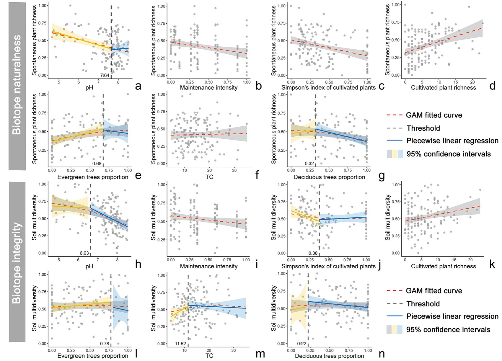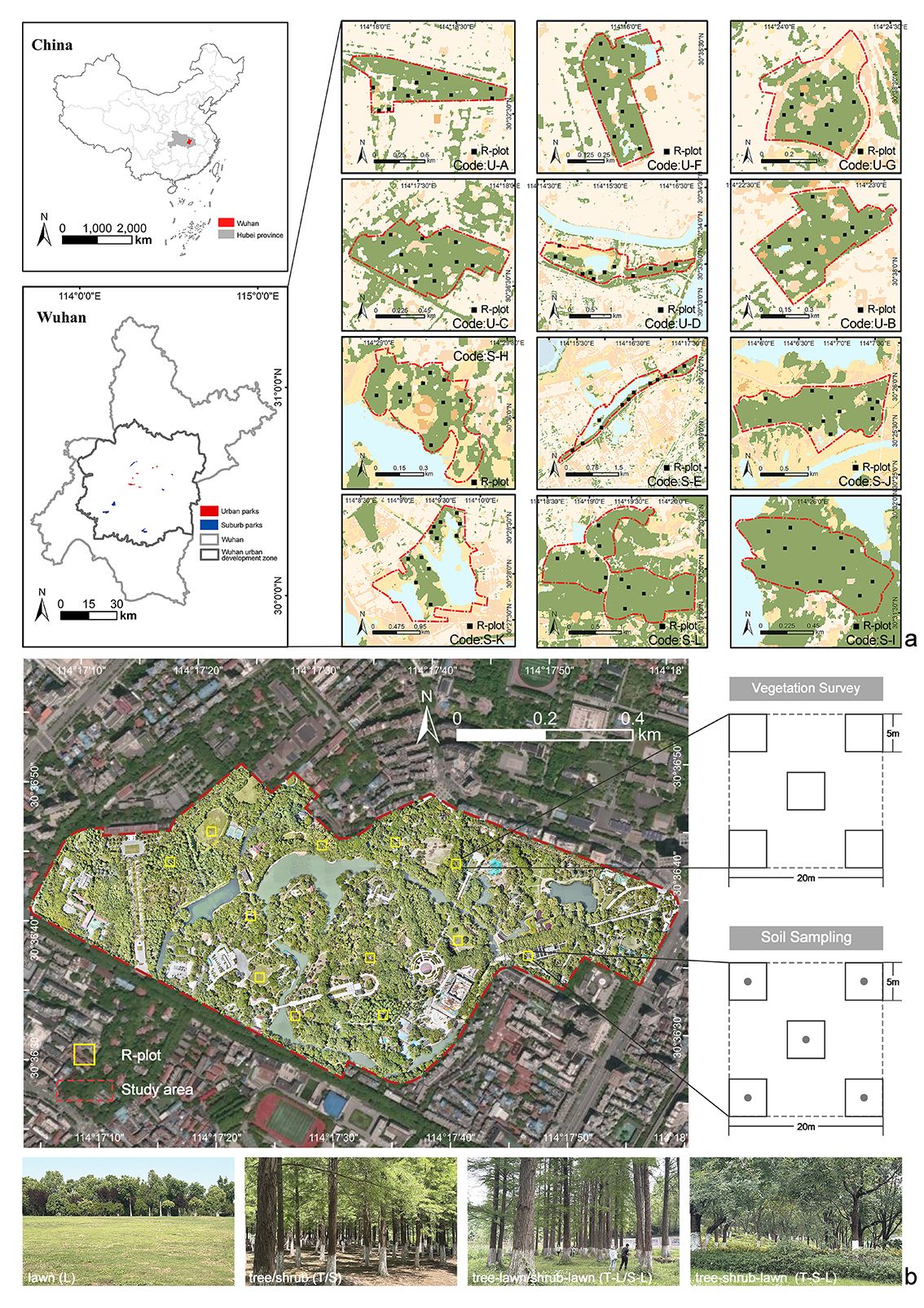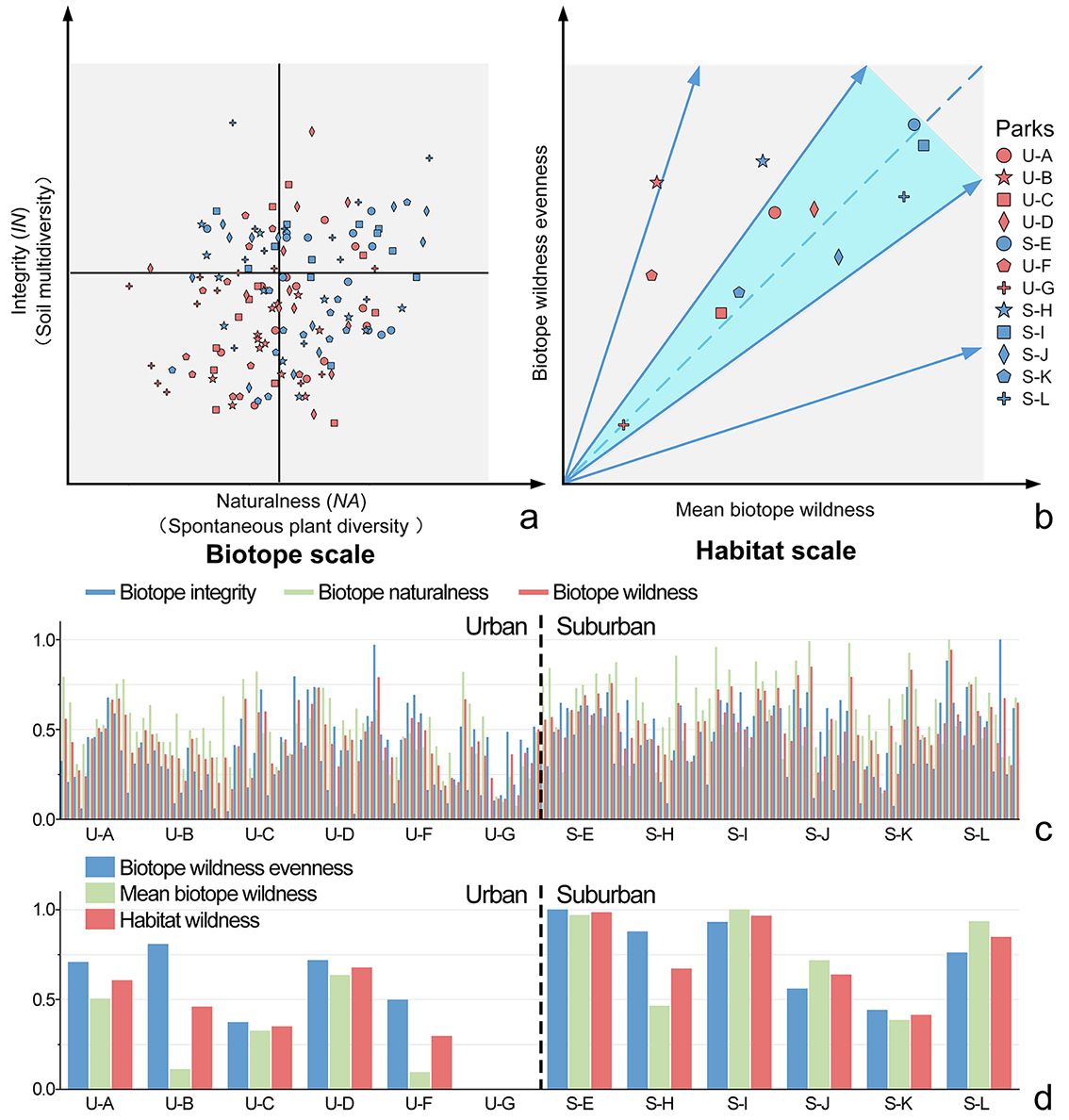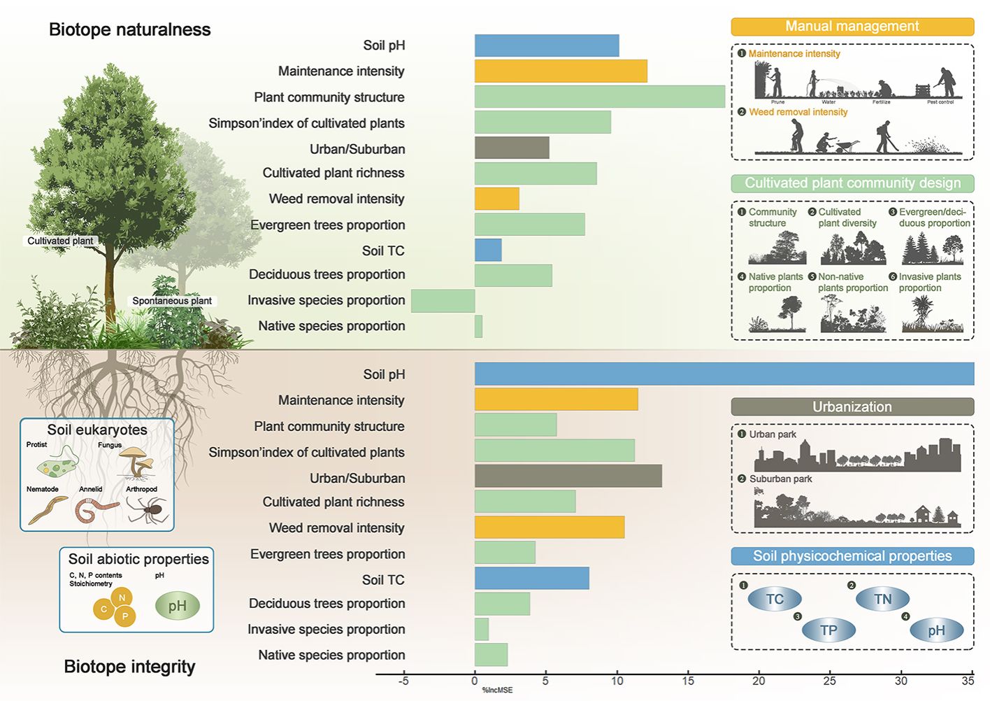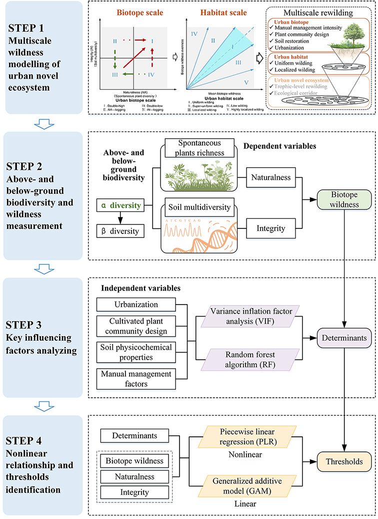 研究基于自组织理论提出了一个多尺度野性概念模型,该模型从生物群落尺度向生境尺度嵌套,整合了生物群落平均野性与野性均匀度两个关键维度。其中,生物群落野性通过自然度和完整性加以衡量。研究团队以武汉市12个核心生境为研究对象,对144个生物群落开展植物调查与土壤采样,并利用通用真核生物引物对(NF1F/18Sr2bR)与高通量测序技术识别土壤主要真核生物类群,评估武汉市核心生境地上–地下生物多样性与野性。随后,进一步结合随机森林算法、广义加性模型和分段线性回归,揭示了城市生物群落野性的决定因素及其阈值。