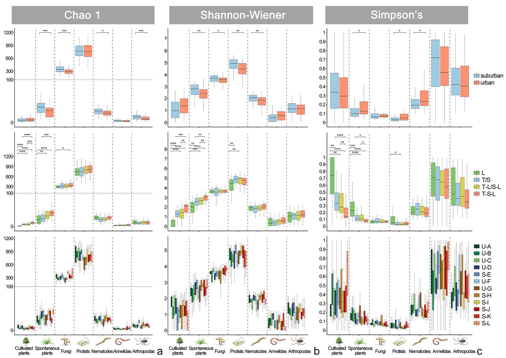 图4 城市与城郊、不同植物群落结构以及不同公园间α多样性差异