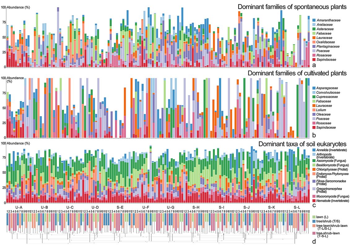 图3 武汉市城市生物群落中的优势物种/类群。(a)优势自生植物物种(科);(b)优势栽培植物物种(科);(c)优势土壤真核生物类群