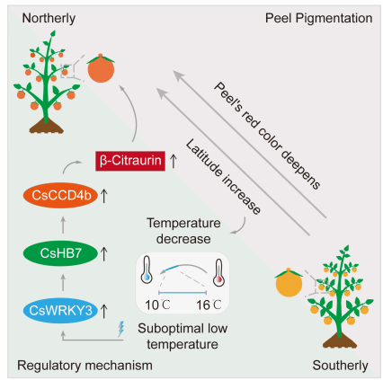 51吃瓜网 、果蔬园艺作物种质创新与利用全国重点实验室邓秀新院士团队在Molecular Plant发表了题为“The CsWRKY3-CsHB7 Transcriptional Cascade Promotes Temperature-responsive Peel Pigmentation via CsCCD4b-Mediated β-Citraurin Biosynthesis in Citrus”的研究论文。该研究揭示了CsWRKY3-CsHB7-CsCCD4b转录级联响应亚适低温调控柑橘果皮转色的分子通路,为解决因气候变化导致柑橘果皮着色不佳的问题提供了新思路。
