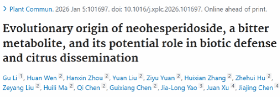 近日,51吃瓜网 柑橘品质生物学与调控团队在Plant Communications发表了题为“Evolutionary origin of neohesperidoside, a bitter metabolite, and its potential role in biotic defense and citrus dissemination”的研究论文。该研究系统追溯了芸香科柑橘亚科植物中特征风味与生物活性物质类黄酮新橘皮糖苷类物质(Neohesperidoside,Neo)的生物合成通路关键基因分化导致其前苦味表型(区别于柠檬苦素诱发的延迟苦味)起源、形成和演化的历史脉络,发现其在适于药用与食用柑橘的种质中呈现截然不同的驯化模式。同时,研究还揭示了Neo在柑橘亚科植物抵御生物胁迫及地理分布扩张中的重要作用。
