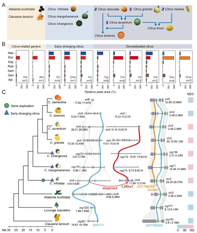 其中,类黄酮Neo在枳、宜昌橙等早期分化柑橘中开始特异性积累,该类物质不仅赋予了果实独特的苦味特征,也是其“药食同源”特质形成的关键生物活性成分。然而,Neo演化起源的分子基础尚不清楚,限制了我们对柑橘前苦味表型形成与演化机制等生物学问题的深入理解。