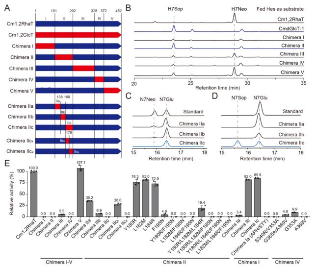 为解析Cm1,2RhaT糖供体从葡萄糖特异性转换成鼠李糖的分子机制,研究利用高氨基酸序列相似度(85.84%)的Cm1,2RhaT和CmdGlcT-1构建了一系列嵌合蛋白,发现区段Ⅱc的替换导致了糖供体特异性的转换,并进一步确定Phe195是该区段的关键残基。同源建模结合分子动力学模拟分析表明,Phe195通过重塑底物结合口袋构象改变Cm1,2RhaT的功能。有趣的是,UGT79B203中对应位点的突变导致其出现Neo合成功能,证实了该位点在Neo演化起源中的关键作用(图2)。