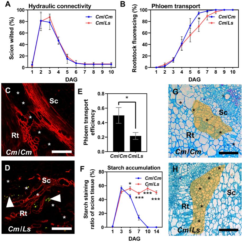 图1. 甜瓜/甜瓜(Cm/Cm)与甜瓜/葫芦(Cm/Ls)嫁接愈合部的维管束功能恢复及愈伤组织增殖