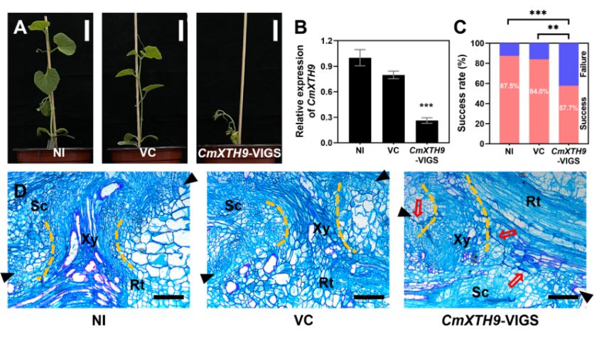 图2. 沉默甜瓜CmXTH9对甜瓜/葫芦嫁接愈合的影响
