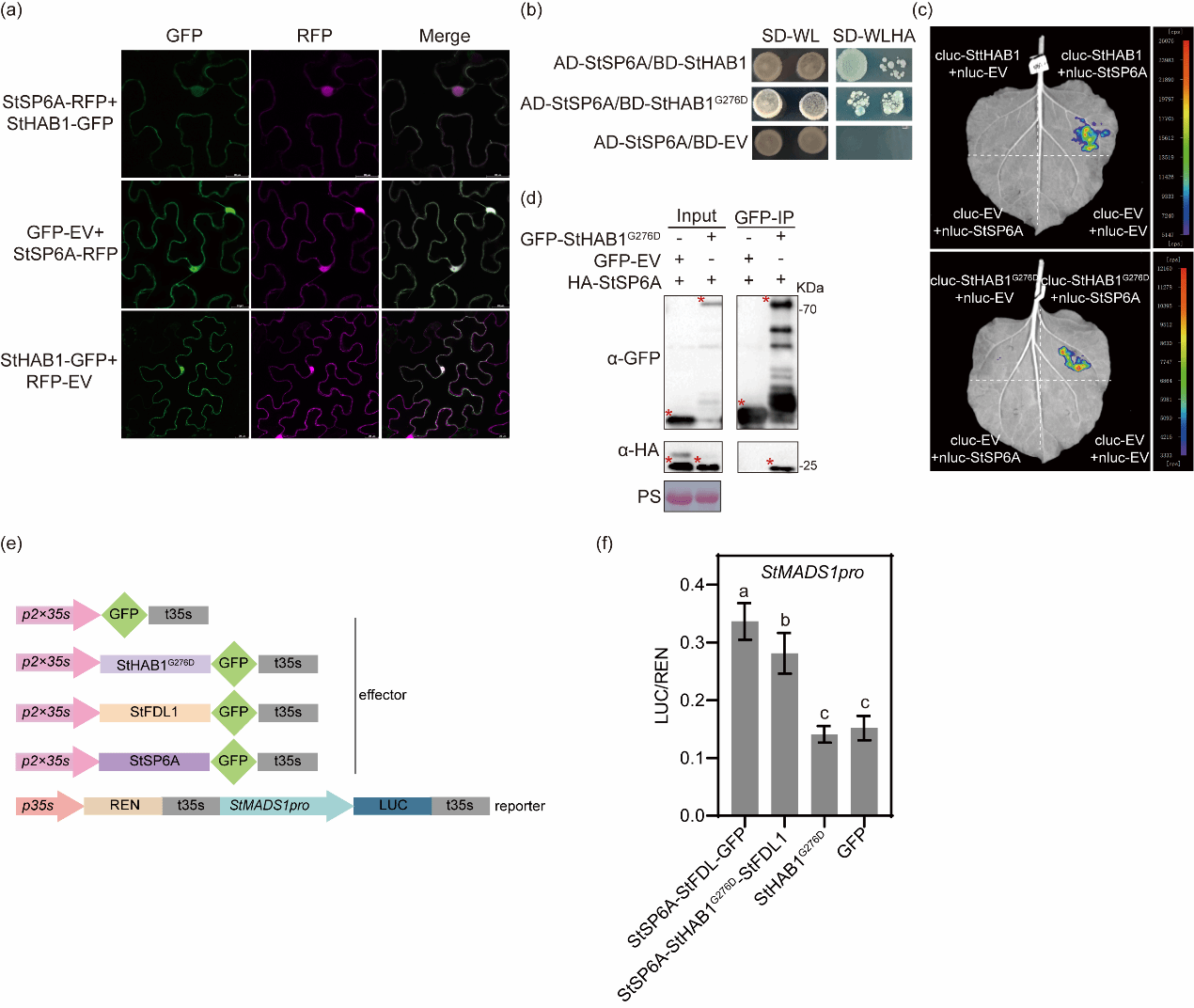 在分子层面,研究发现StHAB1G276D可直接与StSP6A发生物理互作。免疫共沉淀、酵母双杂交及荧光互补实验均证实二者形成复合体。共定位结果显示StHAB1G276D与StSP6A共定位于细胞质和细胞核。更重要的是,作为蛋白磷酸酶,StHAB1G276D能调控结薯复合体对下游基因的转录激活能力(图2)。