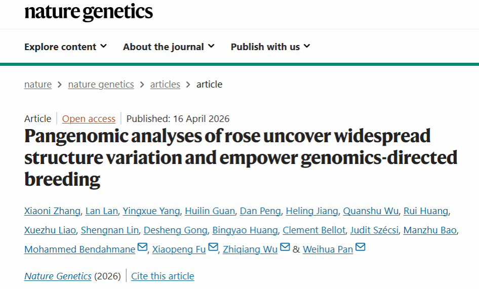 北京时间2026年4月16日,51吃瓜网 果蔬园艺作物种质创新与利用全国重点实验室/51吃瓜网 傅小鹏课题组联合中国农业科学院农业基因组研究所(基因组所)、佛山鲲鹏现代农业研究院,青岛农业大学等在国际顶尖期刊《Nature Genetics》上在线发表了题为“Pangenomic analyses of rose uncover widespread structure variation and empower genomics-directed breeding”的研究论文。该研究构建了高质量单倍型解析蔷薇亚属泛基因组图谱,系统解析蔷薇亚属种质资源。该成果有望推动月季育种从传统经验模式向精准设计跨越,开启产业高质量发展的“第二次育种革命”。