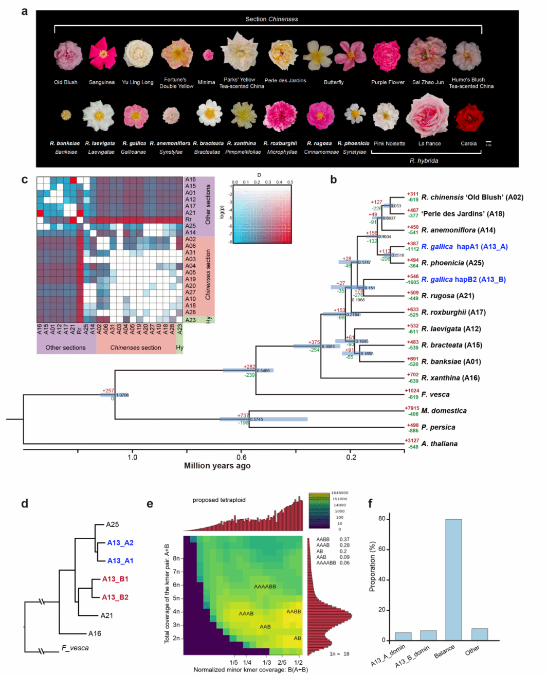 系统发育与群体遗传分析进一步揭示了蔷薇亚属分组间存在广泛的基因渐渗事件,证实了蔷薇亚属内部活跃的遗传交流与巨大的杂交潜力,为理解蔷薇亚属物种形成与适应性进化提供了新见解。研究还精准解析了异源多倍体法国蔷薇和第一个杂交月季‘法兰西’(三倍体)的杂交起源与亚基因组组成,为厘清现代月季复杂的育种历史提供了关键分子证据。