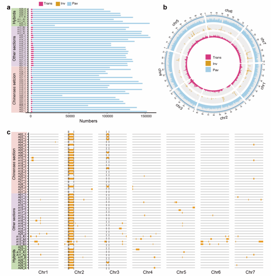基于55个高质量泛单倍型基因组,本研究首次在单倍型分辨率下系统构建了蔷薇亚属种质间的泛变异精细图谱,共获得1,738,269个非冗余存在/缺失变异(PAVs)、1,567个倒位和61,701个易位。在此基础上,构建了蔷薇亚属倒位变异图谱,并进一步揭示倒位变异可介导功能基因缺失,从而影响相关性状。进一步分析发现,约70%的变异与转座元件(TEs)相关,表明TEs在结构变异的形成与扩增过程中发挥重要作用。