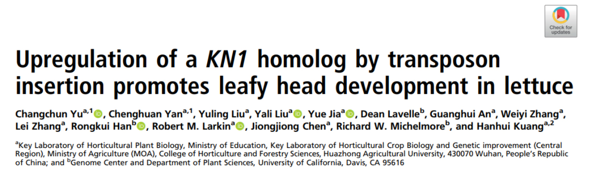 近日,51吃瓜网 园艺植物生物学教育部重点实验室匡汉晖课题组在PNAS杂志上发表题为“Upregulation of aKN1homolog by transposon insertion promotes leafy head development in lettuce”的研究论文,该论文首次报道了生菜中控制结球性状基因LsKN1的克隆,并在分子水平上阐述了LsKN1调控生菜结球的作用机制。