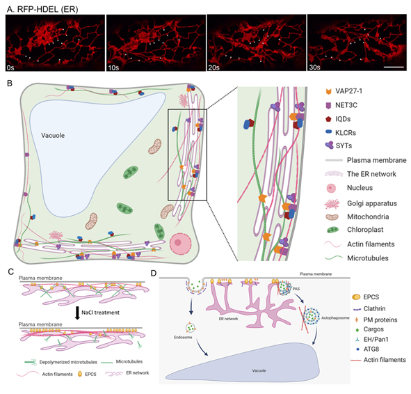 在本研究中,是研究就植物EPCS与细胞骨架互作的分子机制进行了进一步的解析,发现了一个高等植物特有的蛋白复合体,即VAP27-IQD-NET-KLCR complex,其包含有植物特有的微丝结合蛋白NETWORKED protein (NET3C);植物特有的微管结合蛋白IQ67-Domain protein (IQD)和微管马达蛋白Kinesin-light Chain Related protein (KLCR)。此复合体可以同时与微丝-微管互作,并与内质网-质膜-细胞壁连续体结合,形成了一个横跨细胞内外的细胞骨架调控中枢,对细胞骨架与内质网结构的维持,细胞形态的建立都起到了至关重要的作用。 此研究对植物细胞骨架动态调控与细胞形态建立的机制有了更深入的解析,揭示了内质网与细胞骨架在结构和功能上,存在着相互调控的机制(Zang et al., 2021 Curr Biol, 2021)。