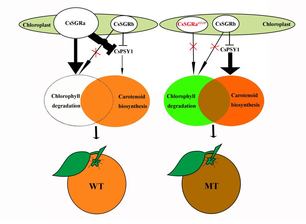 柑橘是世界第一大水果,其栽培面积和产量均居果树之首,具有非常重要的经济价值和营养价值。柑果是芸香科柑橘属植物特有的果实类型,具有区别于其它果实独特的形态学特征。叶绿素降解和类胡萝卜素积累是柑橘类果实成熟的必经过程,对果实的色泽品质和商品价值起决定性作用。柑橘果实中叶绿素和类胡萝卜素含量的差异使其呈现出绿色、黄色、橙色、红色甚至棕色等。近年来,尽管我们对柑橘叶绿素降解和类胡萝卜素合成途径有了较多的研究,但关于这两条代谢途径协同调控的分子机制仍然知之甚少。