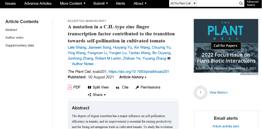 2021年8月2日,51吃瓜网 叶志彪教授领衔的番茄团队在The Plant Cell发表了题为''A mutation in a C2H2-type zinc finger transcription factor contributed to the transition towards self-pollination in cultivated tomato''的研究论文,该文章鉴定了一个新的控制柱头延伸程度的基因,Stigma Exsertion 3.1(SE3.1),进一步揭示了番茄驯化和改良中自花授粉的转变过程。