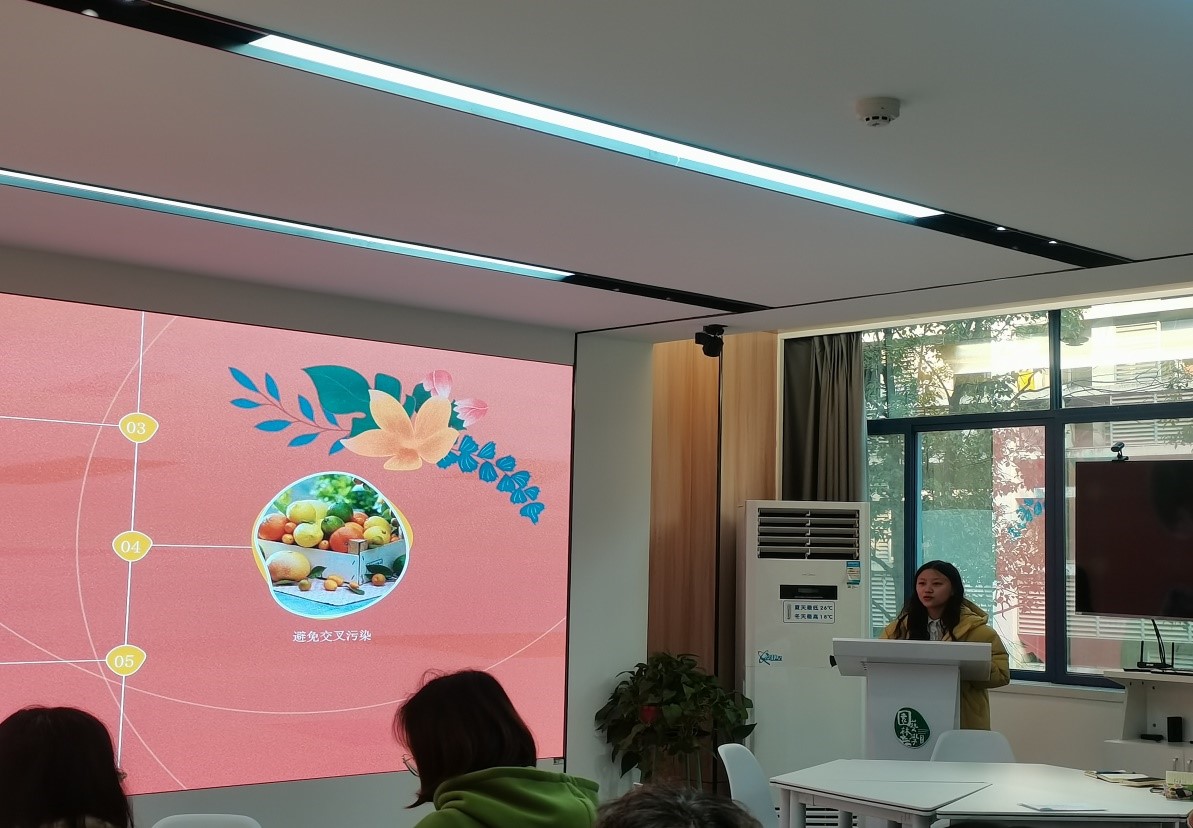 “桃之夭夭,灼灼其华”,潘佳佳用朗朗上口的诗词开头,为同学科普了桃树的常见病害,并着重讲解了桃流胶病的发病时间与症状。潘佳佳在科研过程中也遇到过很多难题,比如种子层积时间长,桃核出芽率低等问题,在失败的教训中,潘佳佳总结出:层级时水分要把控好,要做到无菌操作、多准备层积种子等。