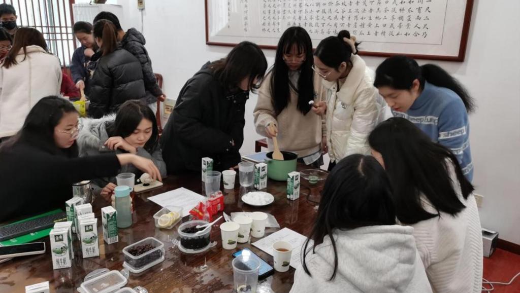 活动现场为同学们准备了焦糖奶茶、港式奶茶、热柠茶等5种奶茶的材料供同学们进行创意调配,在工作人员的指导下,同学们开始了奶茶的制作,通过茶底的选择、茶与奶的调配、配料的添加等步骤调配出了特色奶茶。调配完成后,同学们互相品尝奶茶,不时传来阵阵欢笑,奶茶不仅温暖了大家的身体也拉近了大家的距离,让冬天不再寒冷。