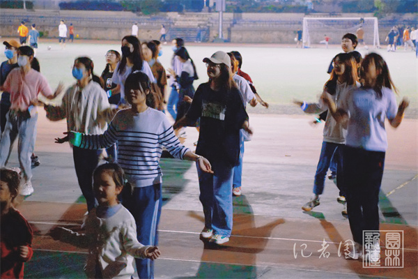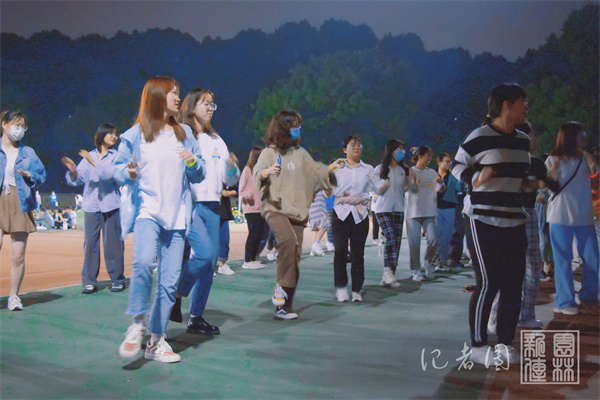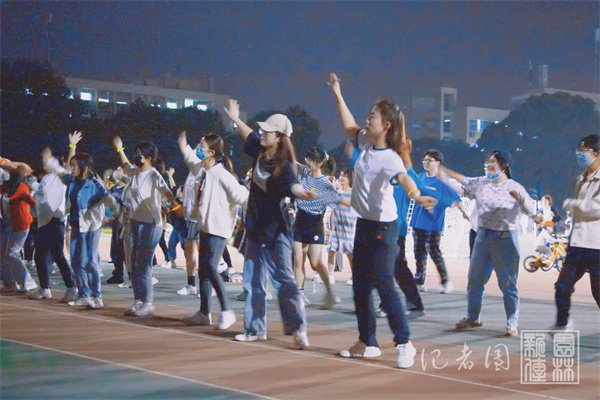 开跳前,工作人员来到活动场地调试话筒、音响等设备,并向参与者发放荧光手环。19:30,活动正式开始,女生部工作人员进行歌曲播放和秩序维护,艺术团成员于最前方领舞。在《别叫我达芬奇》《日不落》《睫毛弯弯》《眉飞色舞》等大家耳熟能详的歌曲旋律中,大家共同跳起了广场舞。