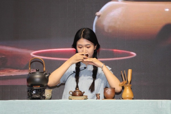 最终,“勤读力耕组”刘奕茗、代铁军、周希全凭借《以茶育人》获得团体赛一等奖,曹雅婷的表演《我与茶相遇的二十年》获得个人赛一等奖。陈玉琼点评道:“大家的茶汤温度适宜,且娄丹丹与曹雅婷根据所泡茶的品种的不同分别对泡茶用水进行了降温与升温这两种不同的泡法,值得学习。”除了肯定选手们的努力外,陈玉琼和王郁就桌布、茶具、服装、背景音乐等方面提出了自己的建议,并表示希望他们往后多加努力、争取更好的表现。