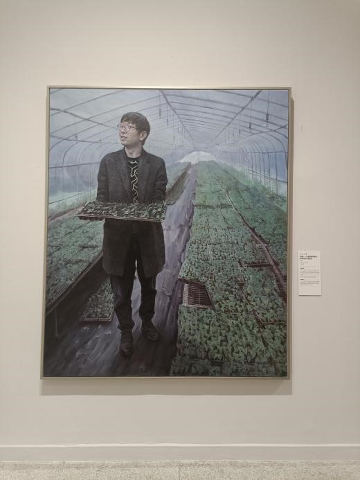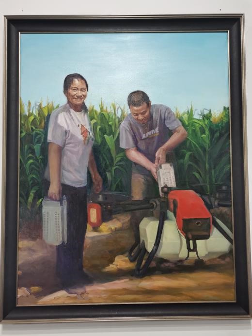 另一幅给人留下深刻印象的作品是《希望的田野》。该作品以本地人文乡情为创作背景,采用现实主义创作手法,表现新时代的农民利用现代科技提升农业生产效率、助力乡村振兴高质量发展的愿望和热情。社会实践团队成员李婧谈到:“习近平总书记指出,中国现代化离不开农业农村现代化,农业农村现代化关键在科技、在人才。作为涉农专业的学生,我们应当增加学科认同感,肩负起兴农报国使命,掌握更多的农业科技知识,用现代科技助力乡村振兴,在‘希望的田野’上无愧于青春,无悔于时代,为实现农业农村现代化矢志奋斗。”