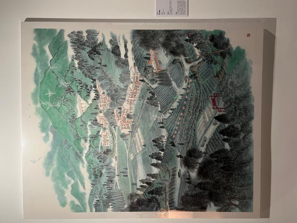 《茶山新韵》采用现实主义表现手法,通过描绘大别山茶园的新面貌,反映了乡村振兴对大别山乡村经济、文化、自然生态带来深远影响。实践团队成员张陆玉谈到:“茶园是该作品的主体,为了表现‘新’的特点,不仅在深山茶园的深处描绘了具有新农村气息的一排排农居小楼,更在纵横交错的茶路上巧妙的绘制了具有新时代特色的电商服务中心、直播带货基地、科技温棚等助飞乡村振兴的新经济形态,呈现了一个现代的、积极的田园诗歌情调。远处的大山中,还有独具中国特色的高铁穿梭其间,是‘要致富,先修路’的经济理念的完美诠释。”