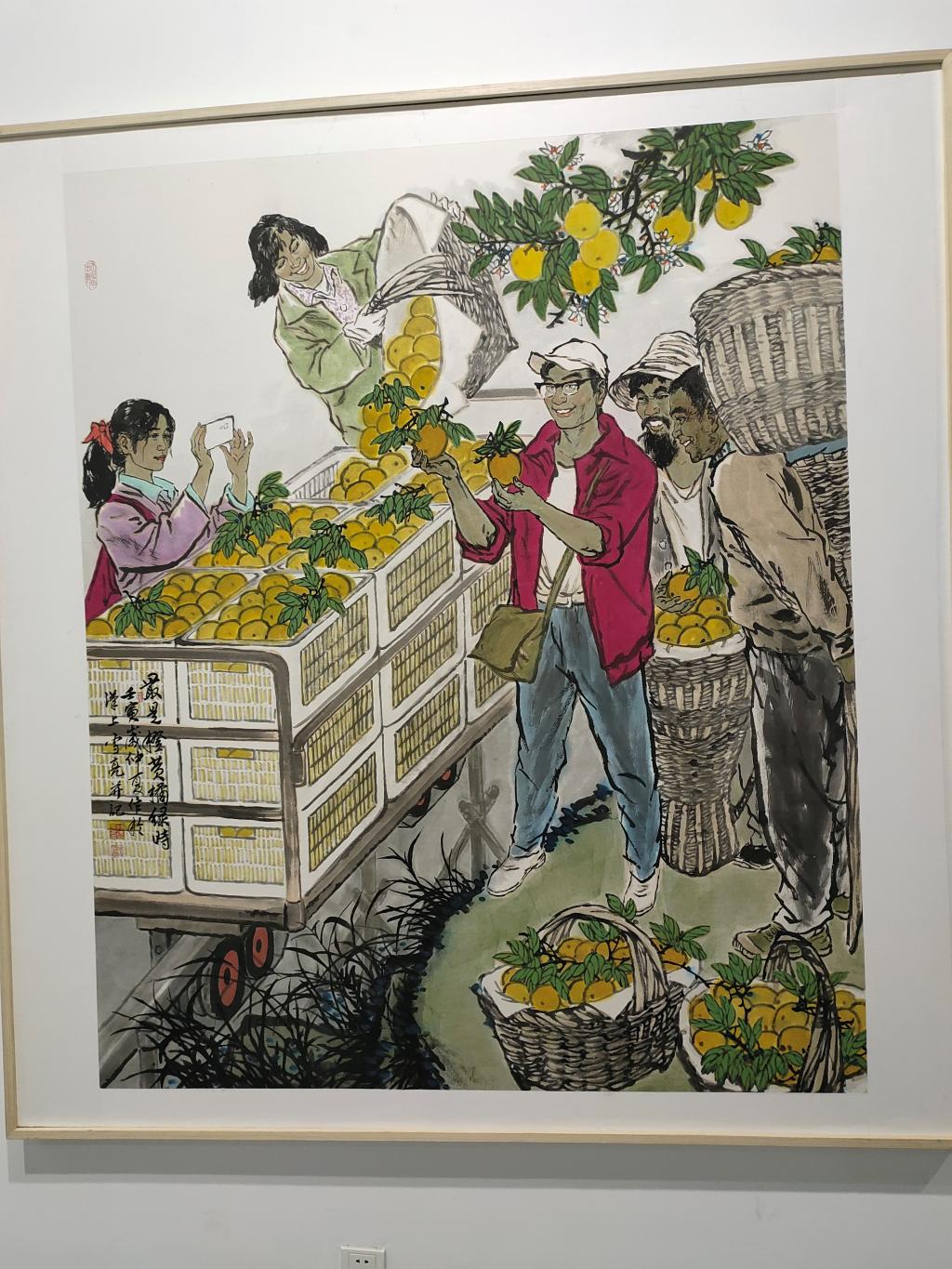 《最是橙黄橘绿时》是湖北省美术于2022年绘制的中国画,该作品描绘了初春时地处三峡的秭归县脐橙丰收的场景。社会实践团队成员岳亚奇分享到:“看到这幅画中五位果农在果园采摘脐橙的场景以及果园一派欣欣向荣的丰收场面,我感受到了新时代繁荣、安定、富裕的乡村风情以及昂扬、乐观的新时代农民气质。”