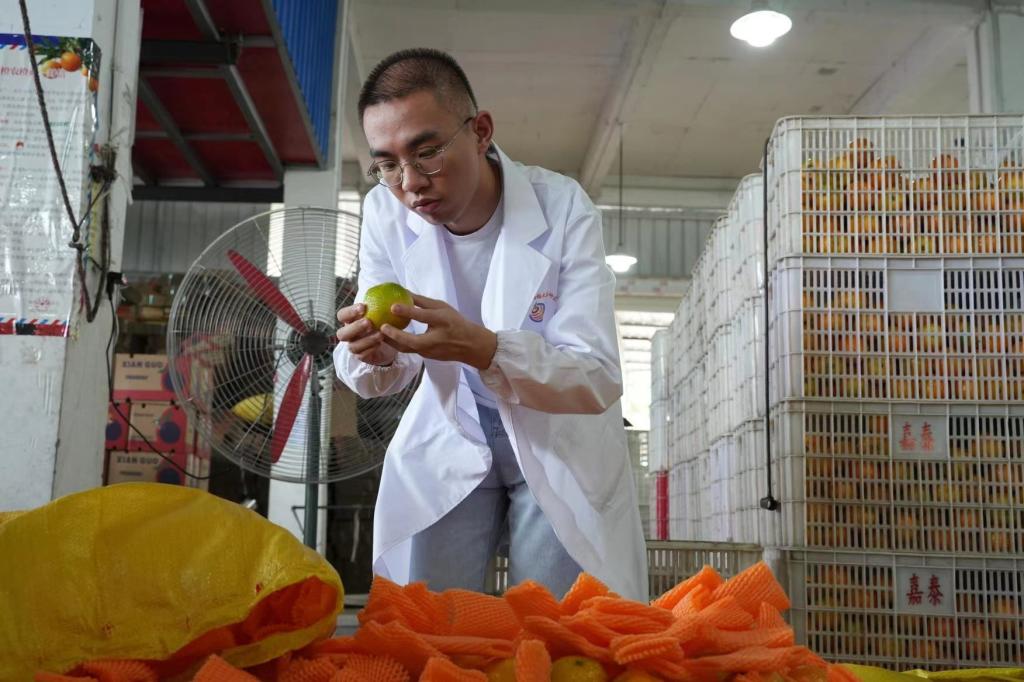 图3 团队成员查看柑橘果实贮藏情况(王梓安 摄)