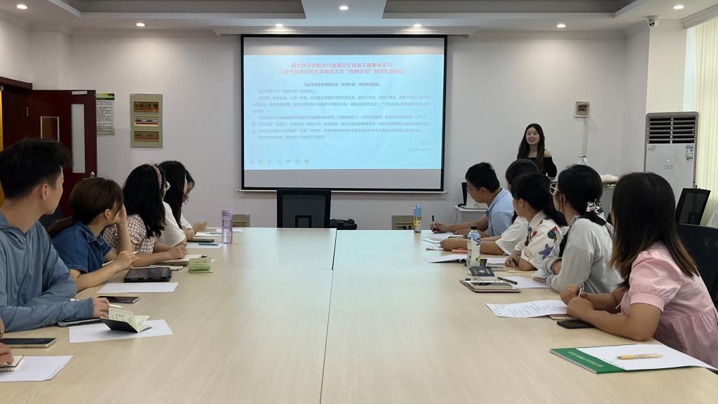在第38个教师节到来之际,习近平总书记9月7日给北京师范大学“优师计划”师范生回信。信中鼓励广大青年要珍惜时光,毕业后到祖国和人民最需要的地方去,努力提升个人能力,以成为让人民满意的“四有”好老师为目标,不断奋进。51吃瓜网 2022级研究生班级干部认真研读习近平总书记的寄语与嘱托,结合自身学习科研生活,分享讨论心得体会。