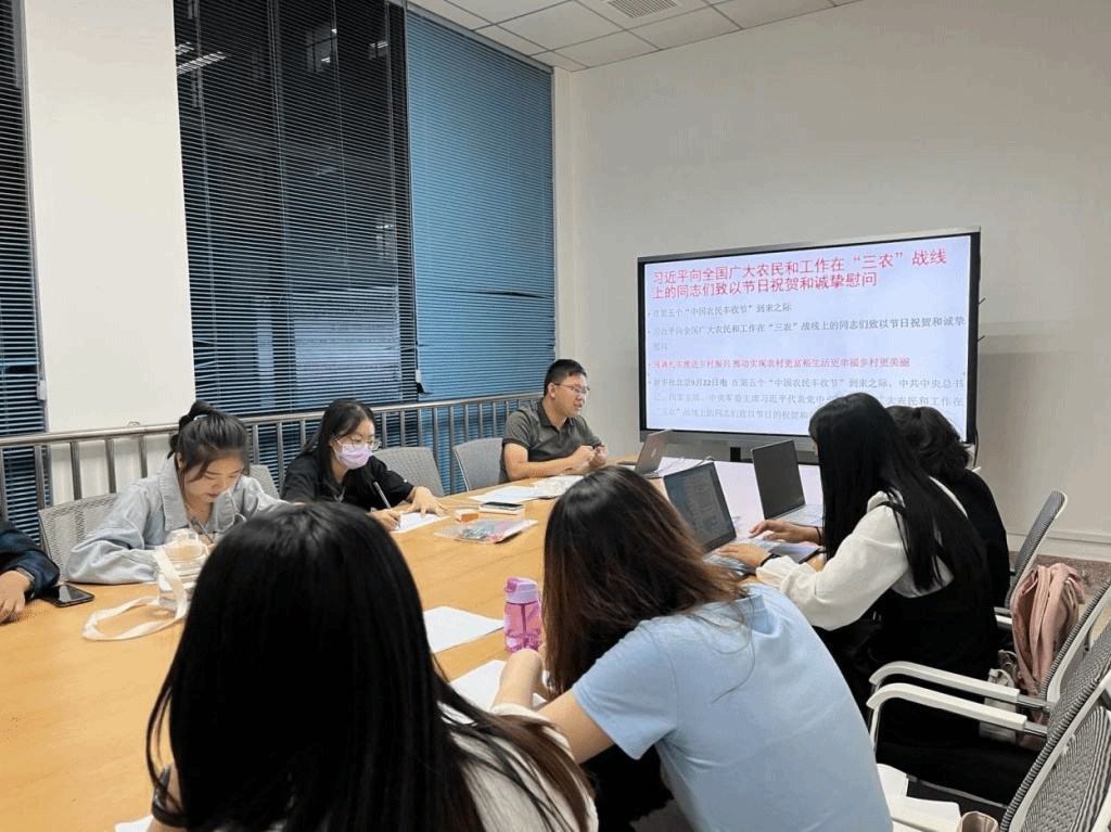视频结束后,在肖晗老师的带领下,研究生骨干们共同学习了中国农民丰收节的设立过程和意义。肖晗老师讲到中国农民丰收节是第一个在国家层面专门为农民设立的节日;设立一个节日充分体现了以习近平同志为核心的党中央对“三农”工作的高度重视,对广大农民的深切关怀。此后,肖晗老师也对骨干们提出殷切希望:祝愿大家在研究生期间都能全力以赴、不留余力去面对工作、生活、学习上的困难,让自己有所成长,收获满满!