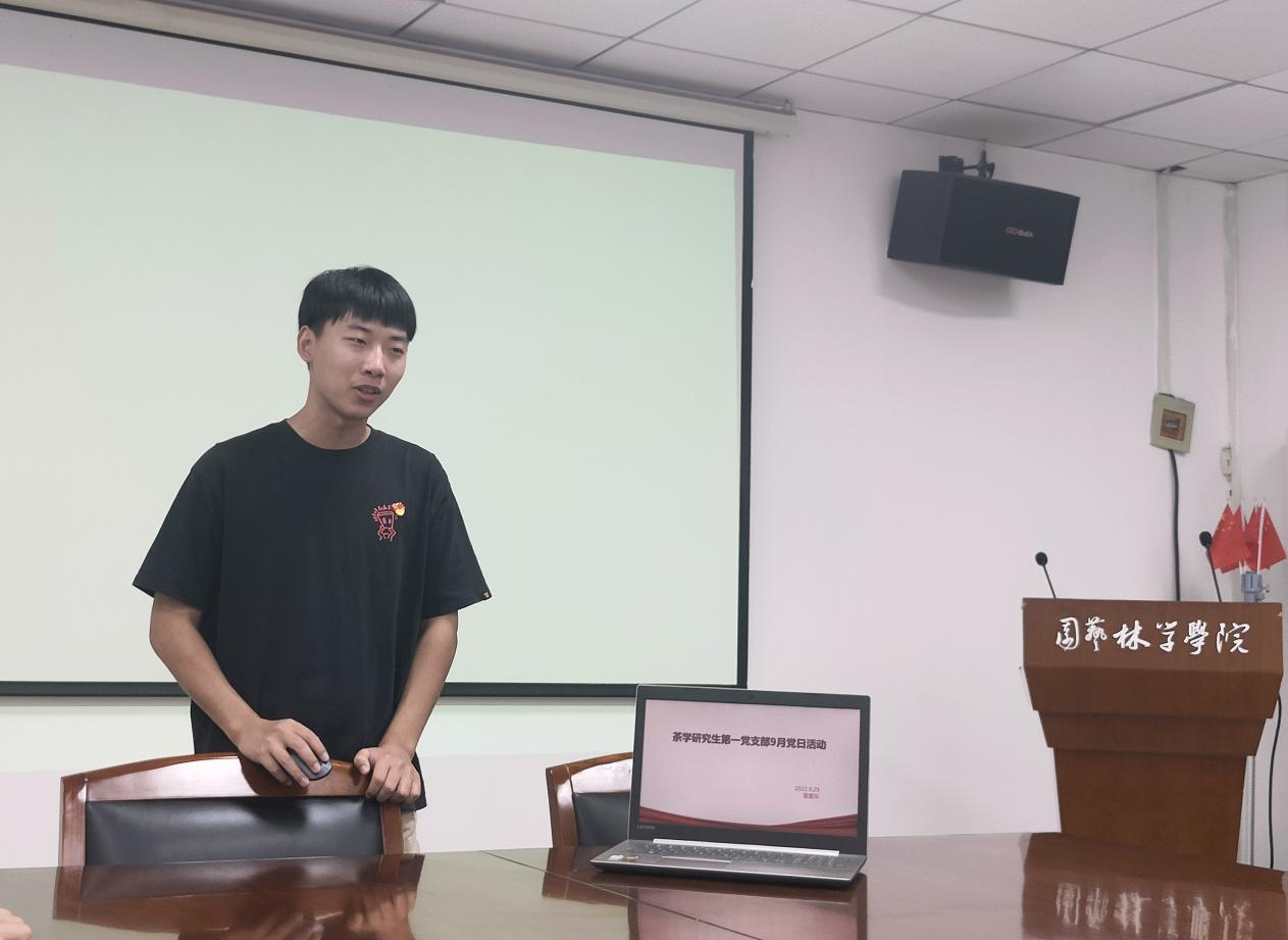 9月28日晚,茶学研究生第一党支部于园林北楼302召开9月党日活动,会议主题分为“学习《习近平谈治国理政》(第四卷)”、“学习习近平总书记给北京师范大学‘优师计划’回信精神”两个板块。党支部书记雷震东主持会议。