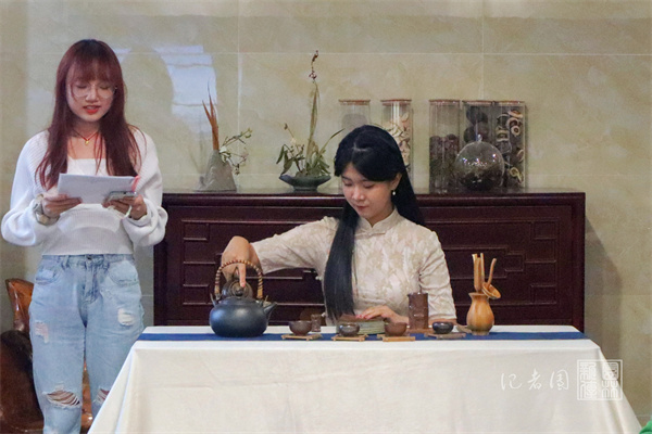 工作交流过后,与会者体验了园林院特色的茶艺和花艺活动,共同感受茶艺之雅、植物之美。来自茶文化协会的曹雅婷和冯钰雯带来陶壶茶艺表演。在悠扬的音乐声中,曹雅婷翻杯洁具,投茶入盏,一举一动尽显优雅,回旋注水,茶叶舒展,茶色清透、茶香氤氲。最后,她举起茶杯,小口轻啜,以佳茗会友,赏茶尝味,其乐无穷。