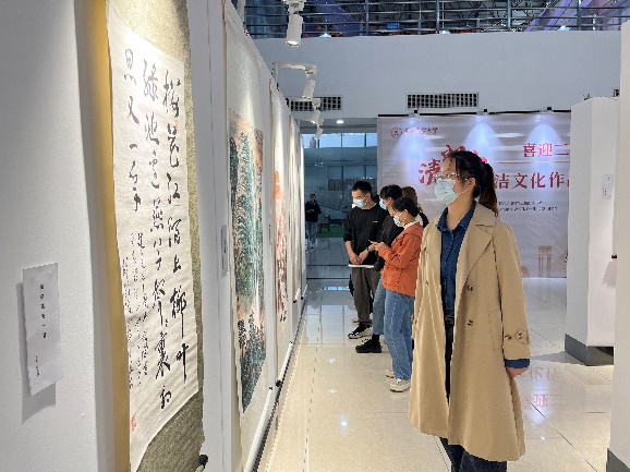 展览分为“峥嵘岁月”“清朗狮山”“盛世中华”三部分,共展出书画类作品68件、短视频类作品12件。另有图书馆馆藏廉政书籍32本参展。作品艺术风格多样,或大气磅礴,或细腻传神,或浓墨重彩,或娓娓道来,用艺术之美来表达爱党、爱国、爱校深情,展现了“华农人”勤读力耕、勤奋求实、勤政廉政的精神面貌。