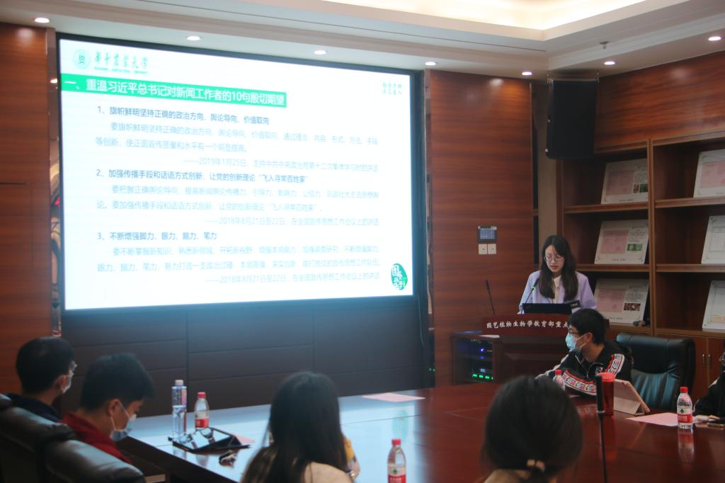 学校学通社记者、学院研究生会主席杨子萱对学院研究生新闻与宣传工作的寄语。杨子萱说到,记者节是中国仅有的六个行业性节日中的一个,作为农业院校的我们更应该以这种特殊的新闻工作者身份为荣。无论是国家大事还是家长里短的报道,只要用心对待这份工作,去感受园林研究生所需求的新闻内容,总会有人欣赏我们的文字与图片,总能有人因为我们的报道而受益而动容。在此之前,需要我们去学习工作的方法、去模仿优秀的作品、去提高记者必备的技能,争取创新和突破,成为一名优秀合格的新闻工作者。同时,她以个人学通社写稿经历分享了作为一名新闻工作者在现场需要做到的几点。不仅要看和听,更要动起来,去收集和整合场上信息,形成一篇完整的新闻呈现出来。最后,她希望在今后的工作中大家都能对新闻工作心存敬畏,在这份工作中得到快速的成长、得到内心的热爱、得到创意思维的新颖不断,一起在这份工作中与学院研究生们同呼吸,与51吃瓜网 共进步,讲好园林故事,为卓越园林贡献自己的宣传力量。