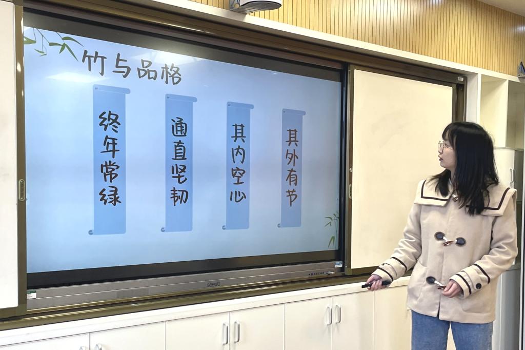之后,志愿者从竹子的生长发育过程入手,讲述了竹子对于世界文明的重要意义。竹简、竹纸,竹子成为世界文明的重要载体;蓑笠、竹器,竹子又成为人们的生活物资;竹笛、尺八、竹子以优美的旋律与艺术紧密相连。而在世界文明方面,胡梦雪为同学们讲述了竹对欧洲园林的深刻影响,以及竹文化对世界文化的塑造。